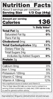 Dried mango is high in vitamin A (20% of the daily value) and a good source of vitamin C. It’s also an excellent source of antioxidants such as carotenoids, ascorbic acid, and phenolic compounds.